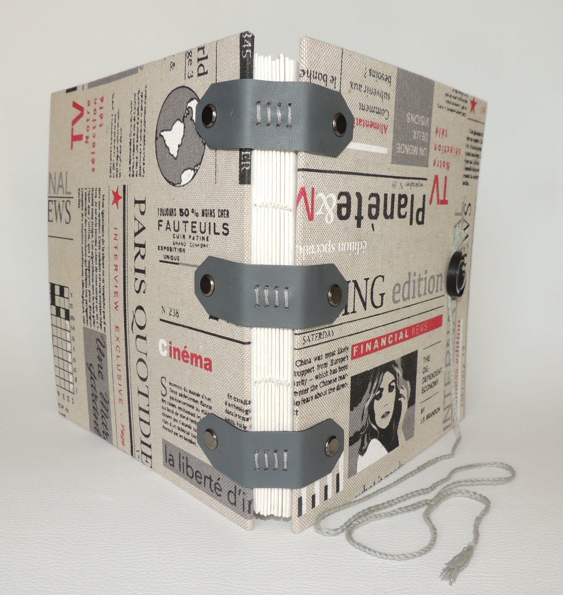 Reliure en tissu, charnière en cuir et tresse en coton. Ouverture à plat. Bord frangé préservé, visible sur certaines feuilles.