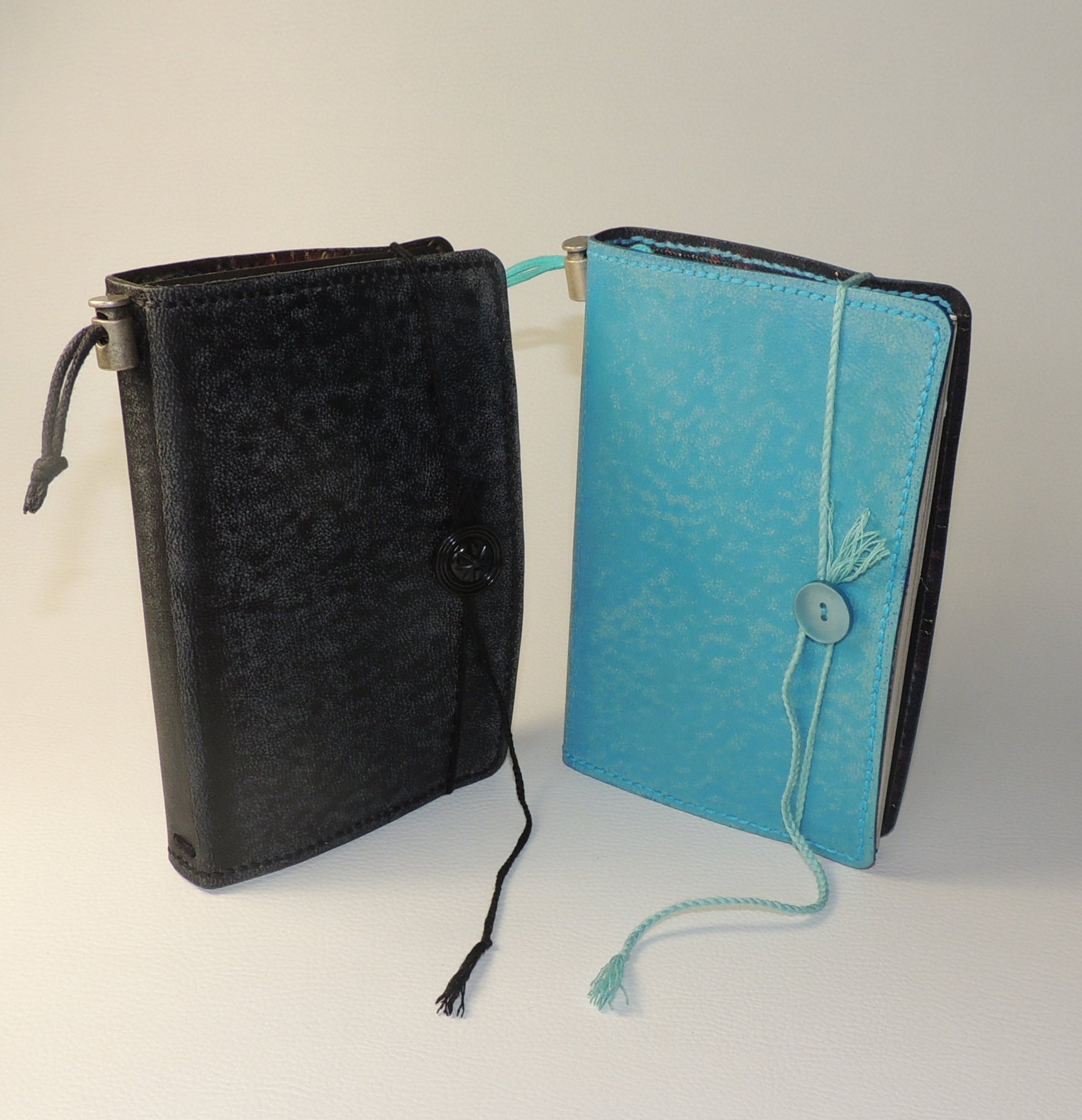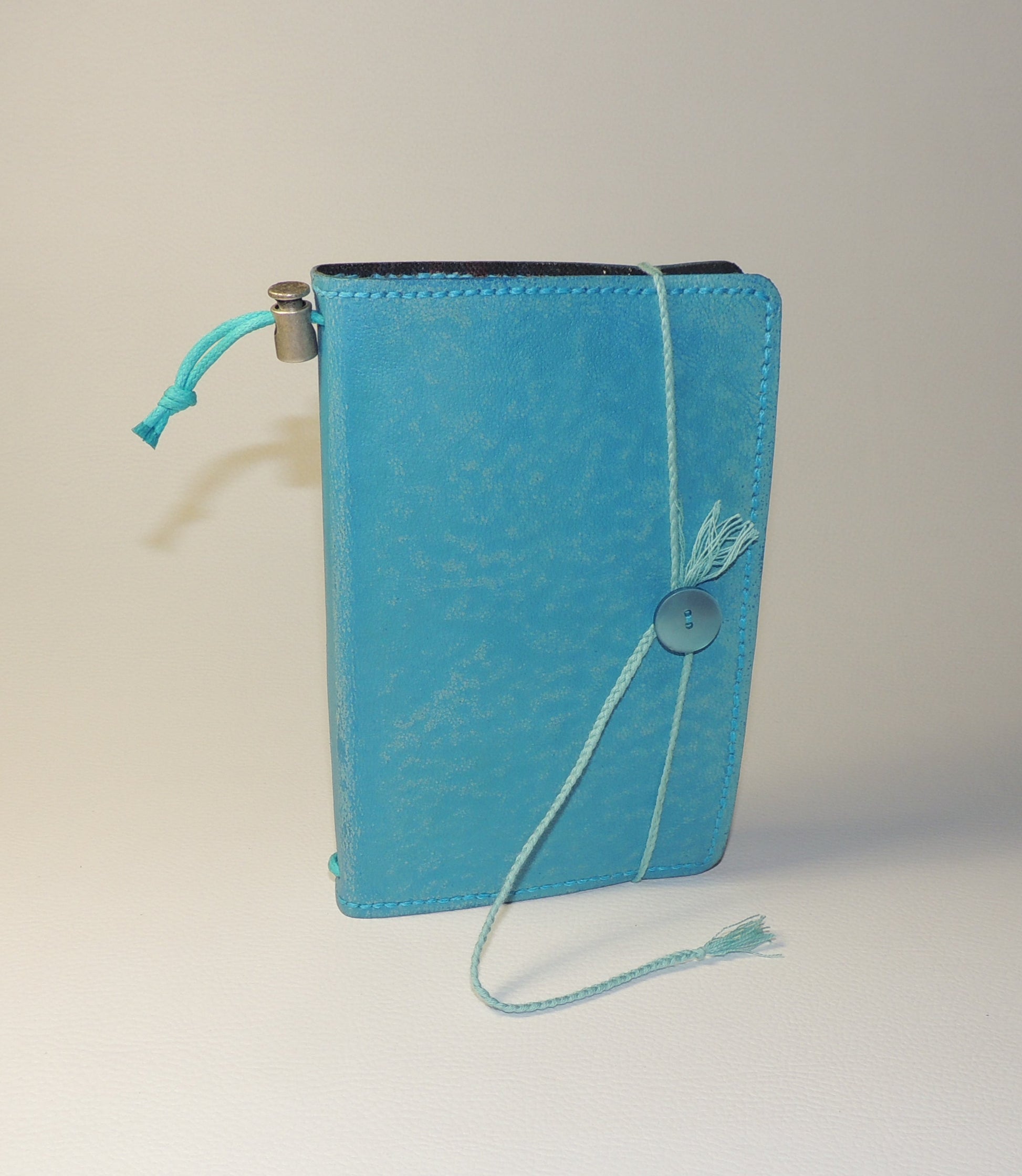 Carnet de voyage rechargeable en cuir, teinté et cousu main, effet vieilli, revêtement intérieur tissu, cordon en coton. Pas de système à élastique pour éviter les usures précoces. Dimension fermée 11 x 17 x 2,5 cm et ouvert 24,5 x 17 cm. Format portrait.