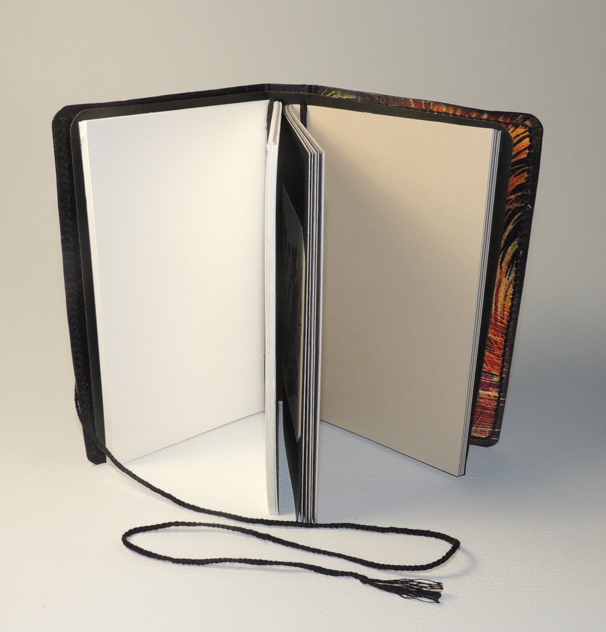 Permet d'insérer deux carnets à dessin, format portrait, relié main, plusieurs types de papier au choix, vendu séparément.