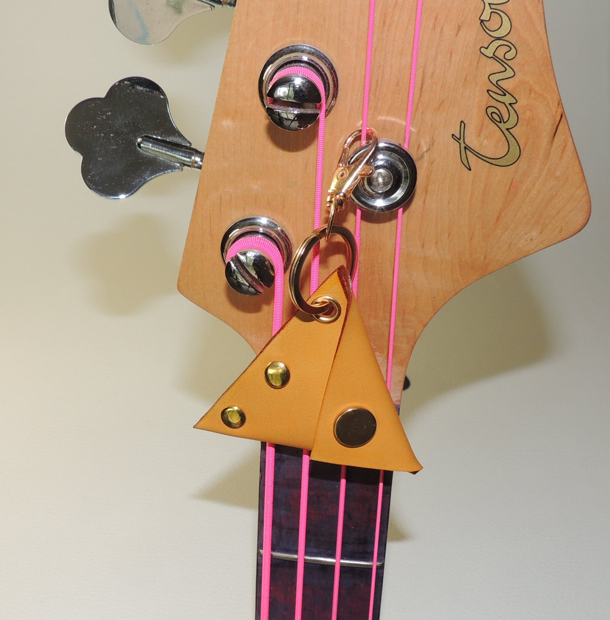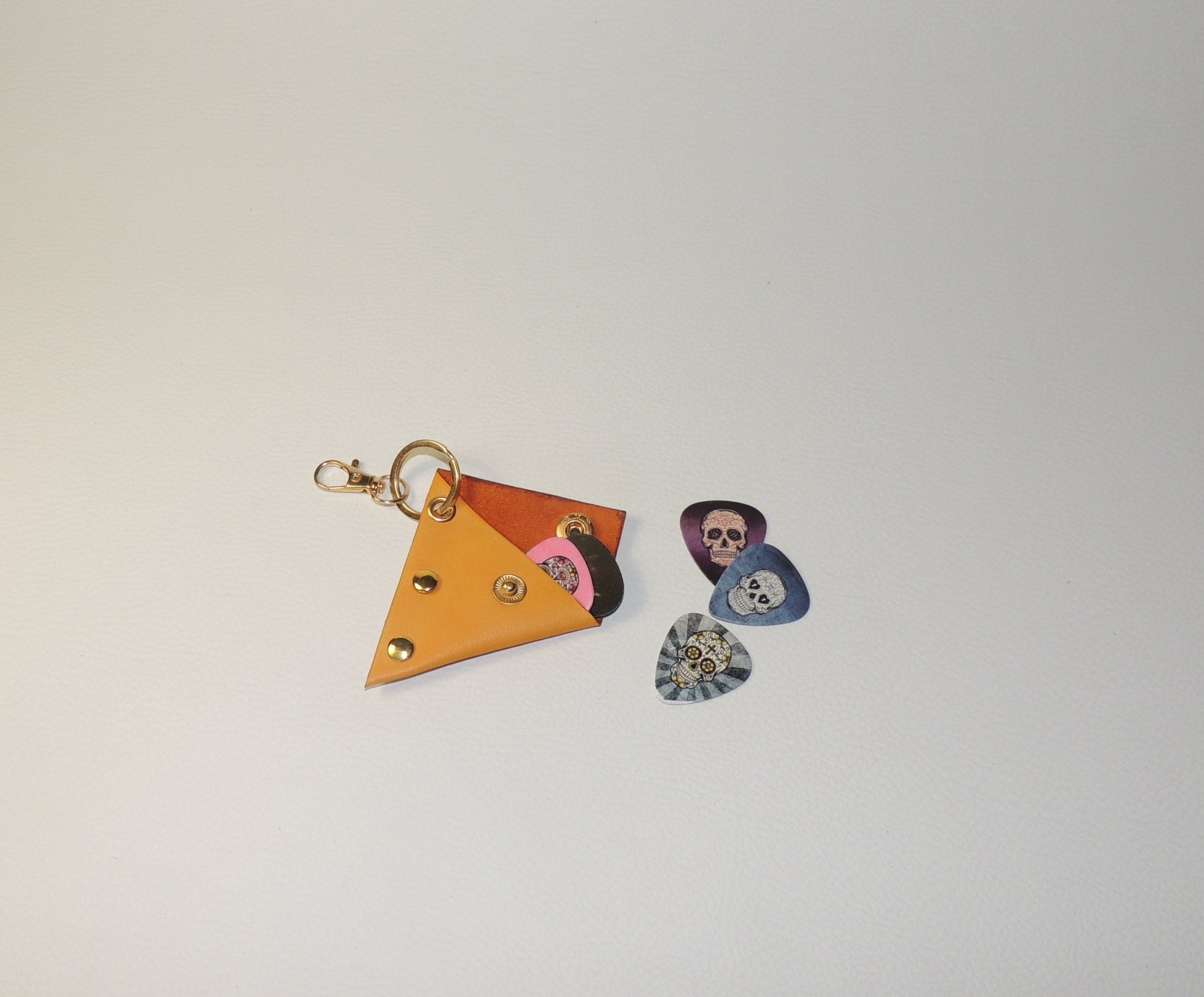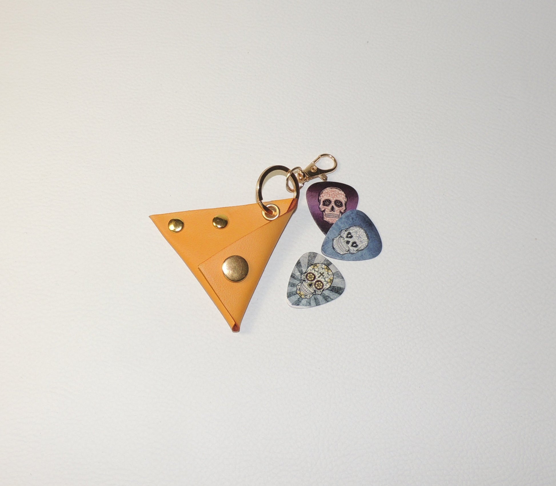 Étui en cuir teinté jaune fixé sur un porte-clés doré avec une fermeture à pression. Conçu en forme de triangle pour contenir jusqu'à six médiators pour guitare ou basse. Réalisation artisanale et fabrication soignée.