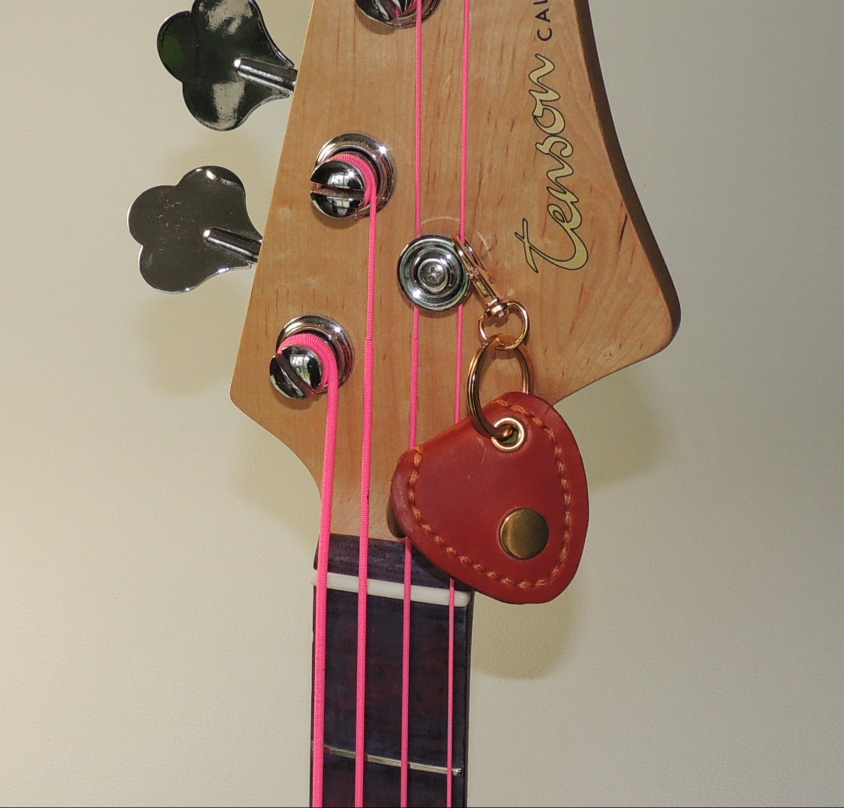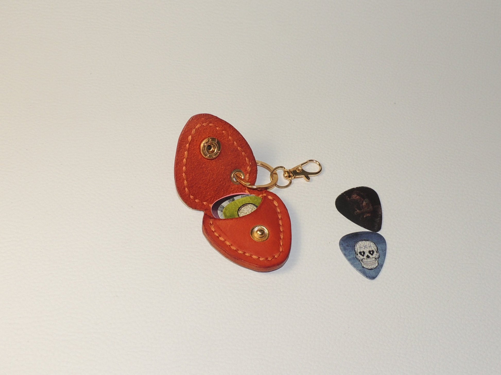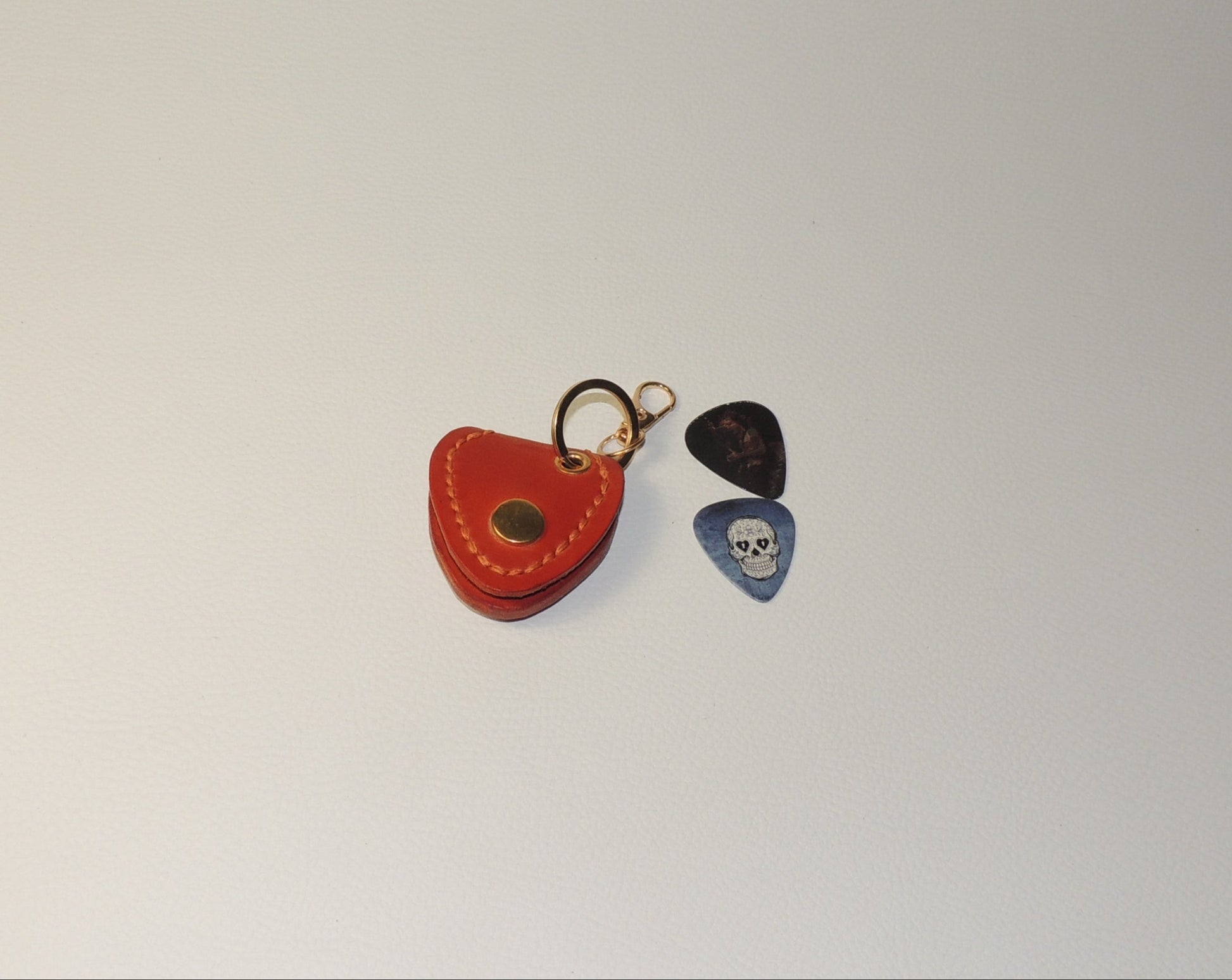 Étui en cuir teinté orange fixé sur un porte-clés doré avec une fermeture à pression. Conçu pour contenir jusqu'à quatre médiators pour guitare ou basse. Réalisation artisanale et fabrication soignée.